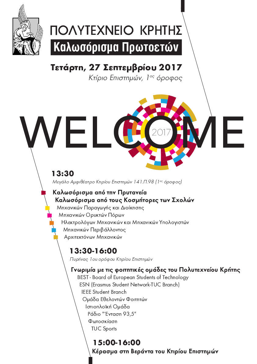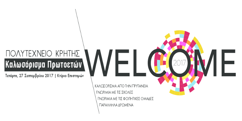 Το Πολυτεχνείο Κρήτης, με μεγάλη χαρά, καλωσορίζει και φέτος τους πρωτοετείς φοιτητές και φοιτήτριές του σε εκδήλωση που θα πραγματοποιηθεί στο Κτίριο Επιστημών στην Πολυτεχνειούπολη, την Τετάρτη 27/09/2017 και ώρες 13:30 έως 16:00. Η εκδήλωση αποτελεί μια ευκαιρία γνωριμίας των πρωτοετών με το Πολυτεχνείο Κρήτης!