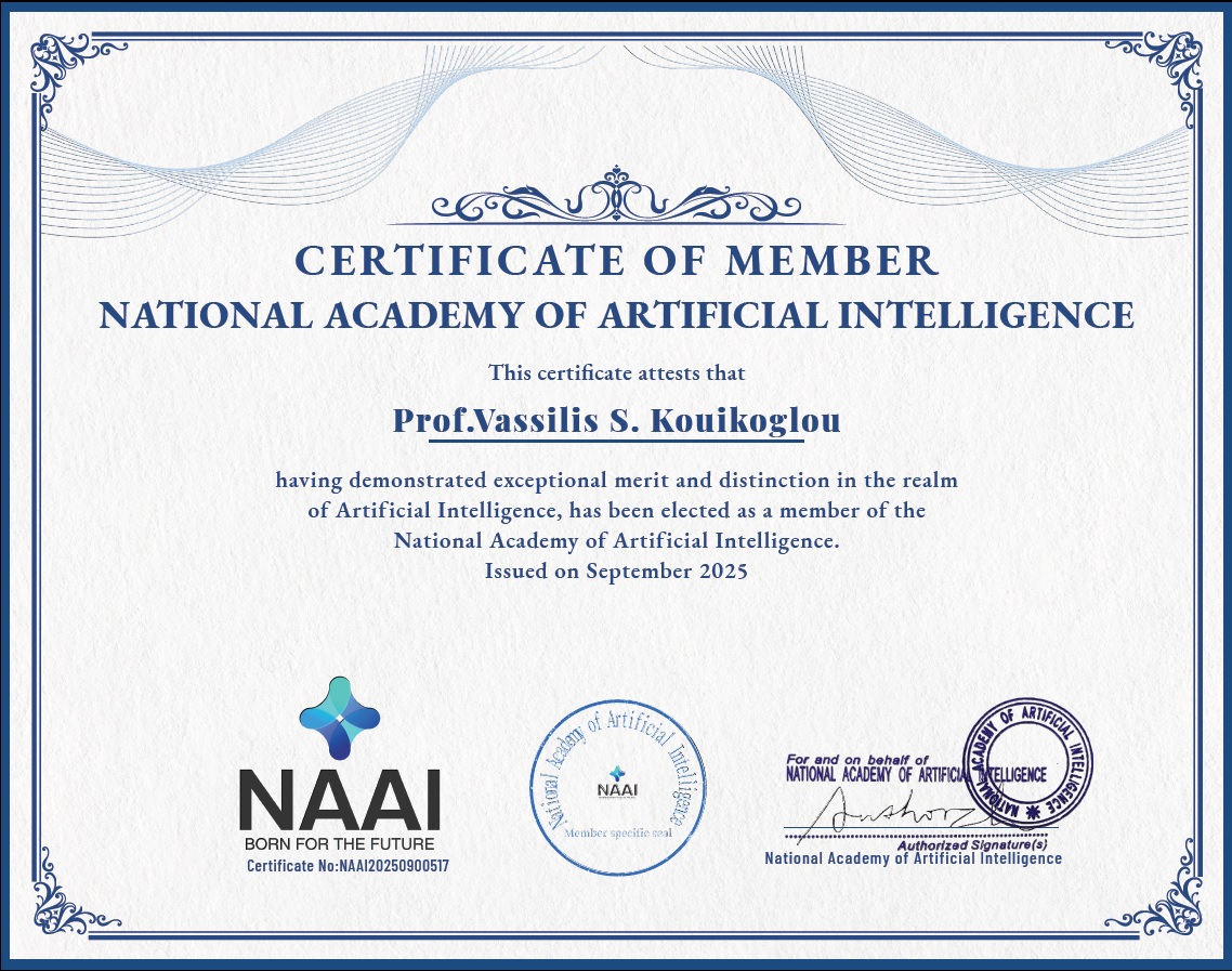 Ο καθηγητής της Σχολής Μηχανικών Παραγωγής και Διοίκησης, Βασίλειος Κουϊκόγλου, εξελέγη τον Σεπτέμβριο 2025 μέλος της National Academy of Artificial Intelligence. Η εκλογή αυτή αποτελεί σημαντική διεθνή διάκριση, καθώς αναγνωρίζει τη συμβολή του καθηγητή Κουϊκόγλου στην προώθηση της έρευνας και της καινοτομίας στον τομέα της τεχνητής νοημοσύνης, καθώς και το έργο του στη διασύνδεση των εφαρμογών της με τη βιομηχανική παραγωγή, τη διοίκηση και τη λήψη αποφάσεων. Η National Academy of Artificial Intelligence είναι ένας διεθνώς αναγνωρισμένος οργανισμός που έχει ως αποστολή την προώθηση της επιστημονικής αριστείας στην τεχνητή νοημοσύνη. Στόχος της είναι η ενίσχυση της ακαδημαϊκής συνεργασίας, η προώθηση της διεπιστημονικής έρευνας και η ανάπτυξη πρωτοβουλιών που συμβάλλουν στη δημόσια κατανόηση των εφαρμογών της τεχνητής νοημοσύνης, αλλά και των κρίσιμων ζητημάτων δεοντολογίας που τις συνοδεύουν.